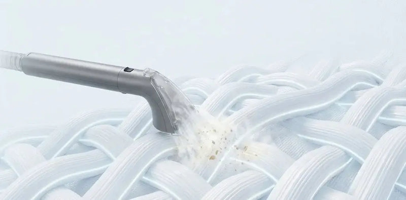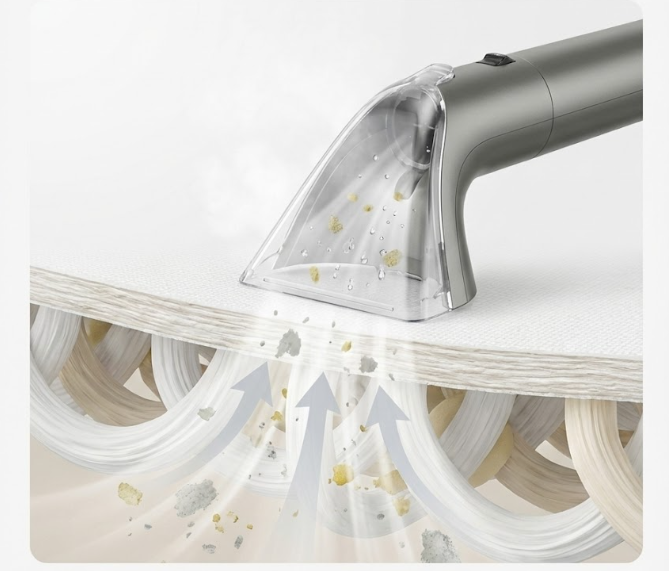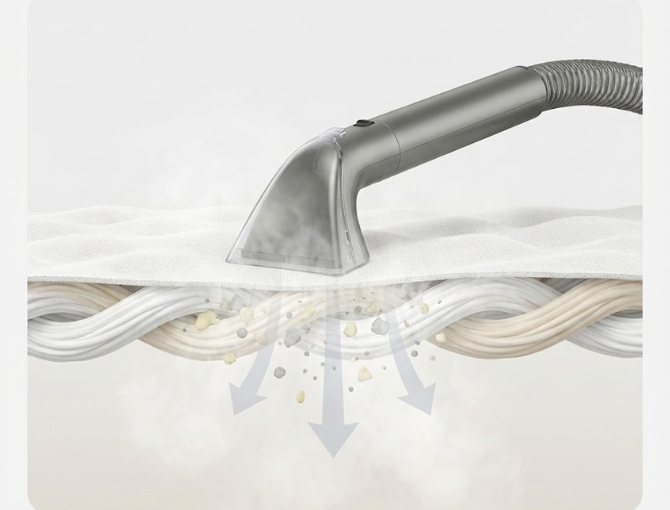 高温スチームが繊維の奥まで浸透し、固まった汚れをふやかして浮かせます。次の吸引ステップがより効果的に作用します
