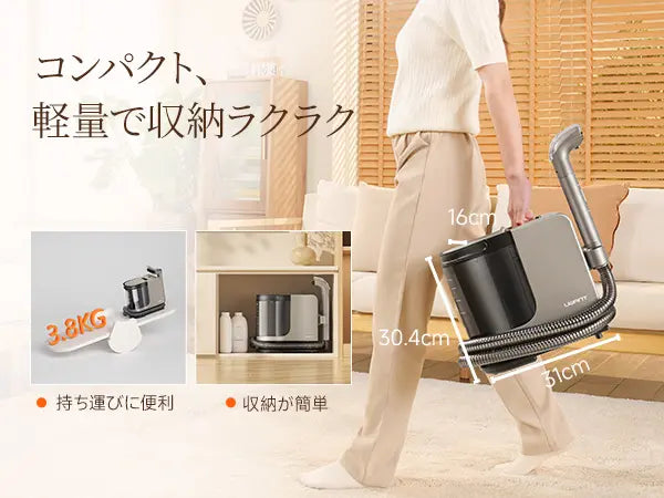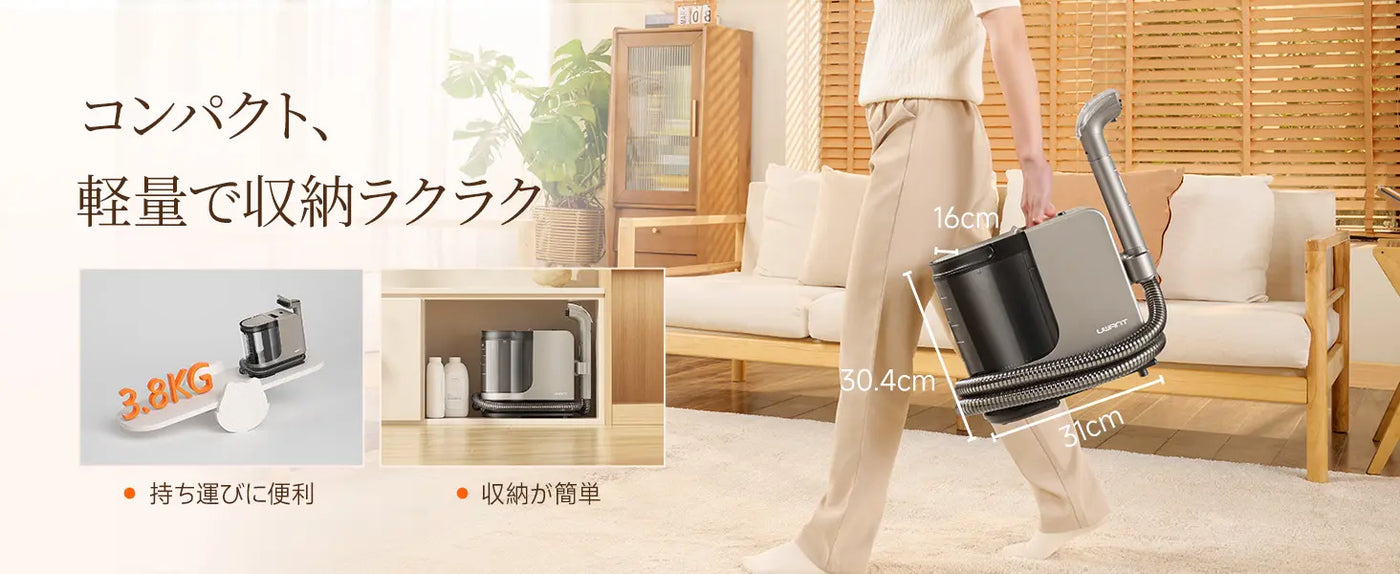 使いやすさにも徹底的にこだわりました。約 3.76kg の軽量設計で、誰でも片手で簡単に持ち運び可能。31×16×29.6cm のコンパクトサイズで収納場所にも困りません。1200ml 清水タンク × 1400ml 汚水タンクにより給排水頻度を大幅に減らし、清掃効率を向上。3m 電源コードと 1.6m ホースで最大約 4.6m の広範囲をカバーし、リビング・寝室・車内・階段などあらゆる場所で快適に使用できます。
