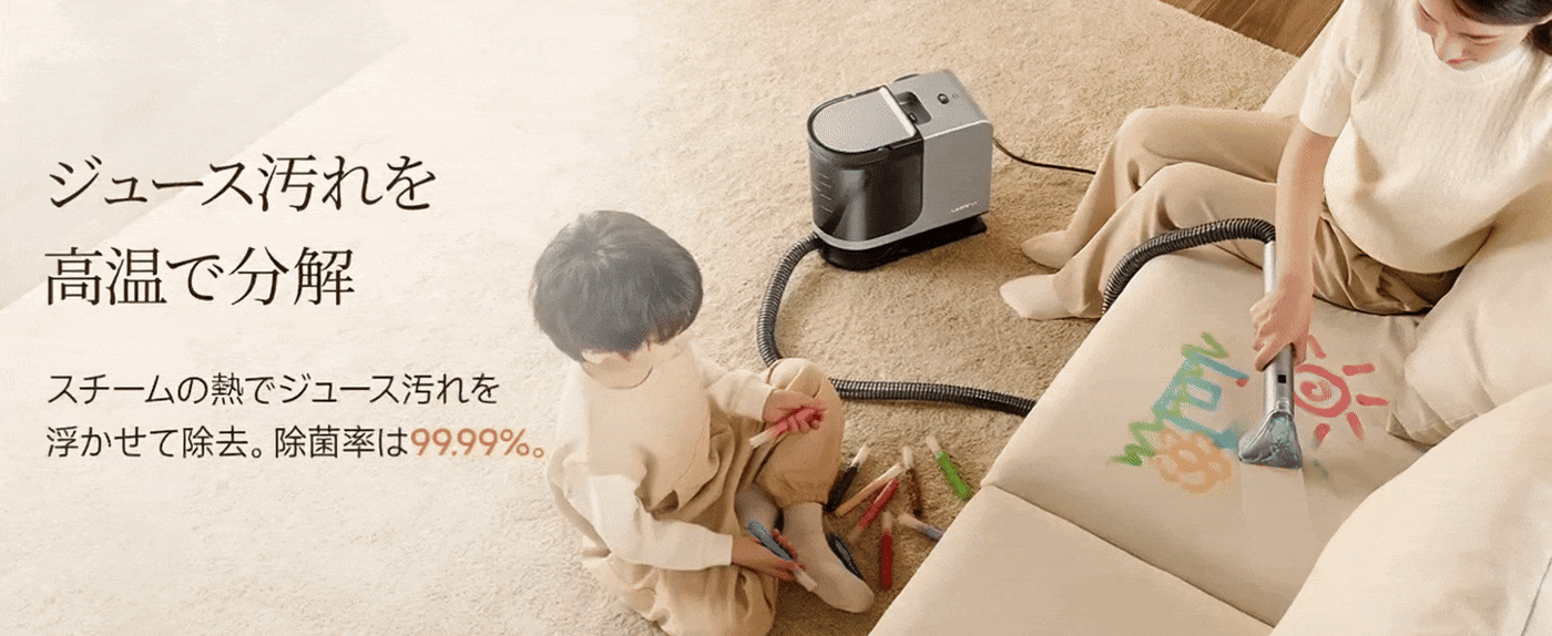 一般的な清掃は表面だけをきれいにすることが多いですが、実際の汚れは繊維の奥深くに入り込んでいます。UWANT B400 は 100℃の高温スチームで油汚れ・尿ジミ・食べこぼしなどの頑固な汚れを瞬時に分解し、繊維内部に潜む細菌やダニも強力に除去します。さらに 60℃ 温水洗浄が日常的な汚れをやさしく溶かし、生地を傷めず奥までしっかり洗浄。表面から深層までムラなく洗い上げ、布製品がまるで新品のように蘇ります。
